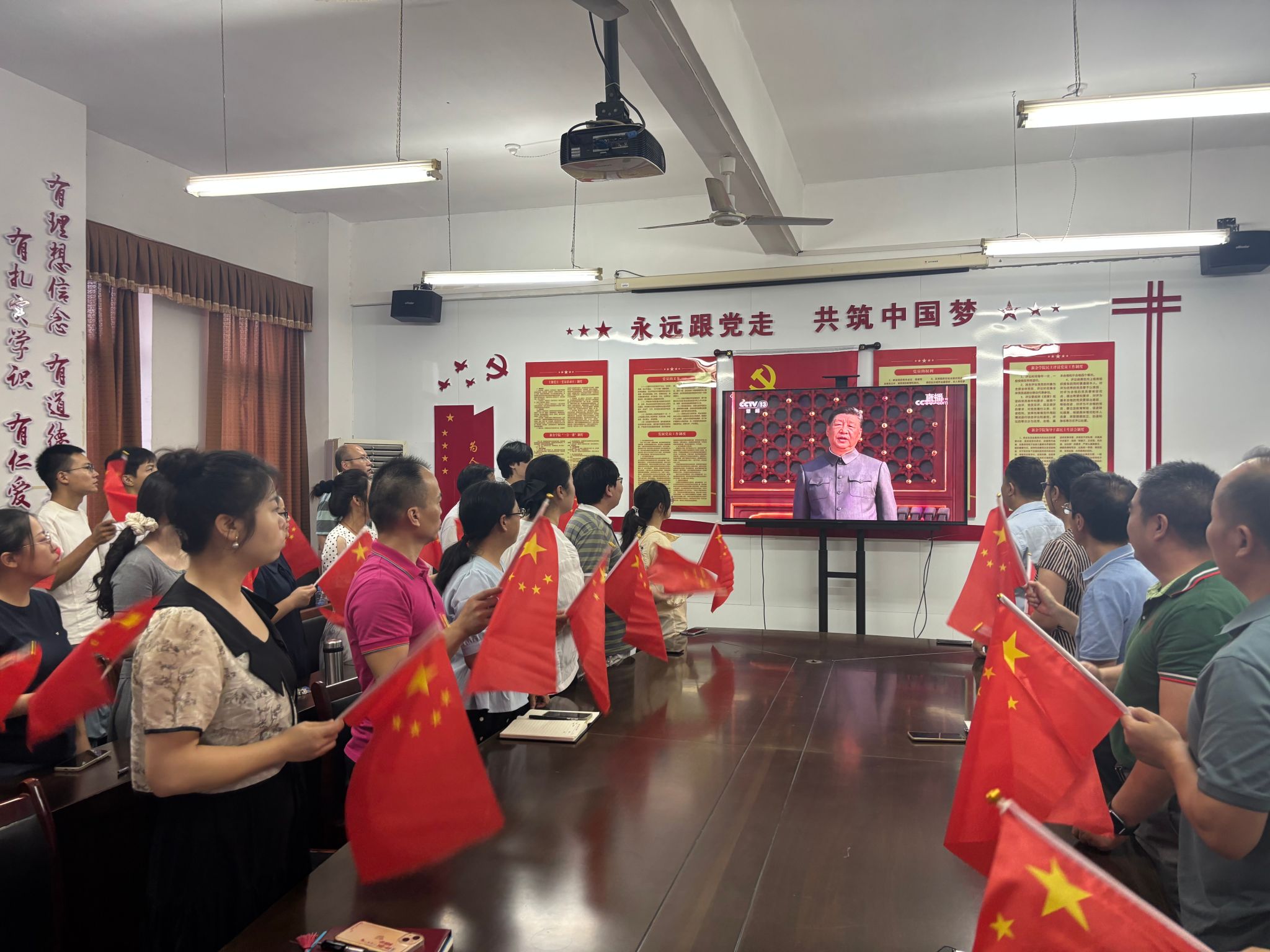 9月3日上午,公司党委组织全体教职工党员、青年教师及部分员工代表50余人,在公司党员活动室集中收看纪念中国人民抗日战争暨世界反法西斯战争胜利80周年阅兵式直播。8时50分,会议室已座无虚席,师生们手执小国旗,静候盛典开始。 9时整,礼炮轰鸣,国旗护卫队迈着铿锵步伐走过天安门。屏幕前的师生全体起立,齐唱国歌。当信息作战模块的无人侦察方队亮相时,现场爆发出热烈掌声。公司党委书记晏志勇表示:“抗战精神薪火相传,今天的和平来之不易。作为信息人,我们要把爱国情、强国志融入科研教学,在芯片、网络安全等领域实现更多突破。” 观看结束后,员工代表、2023级电子信息工程专业祝文迪同学激动地说:“阅兵式不仅展示了大国重器,更让我体会到科技自立的重要性。”