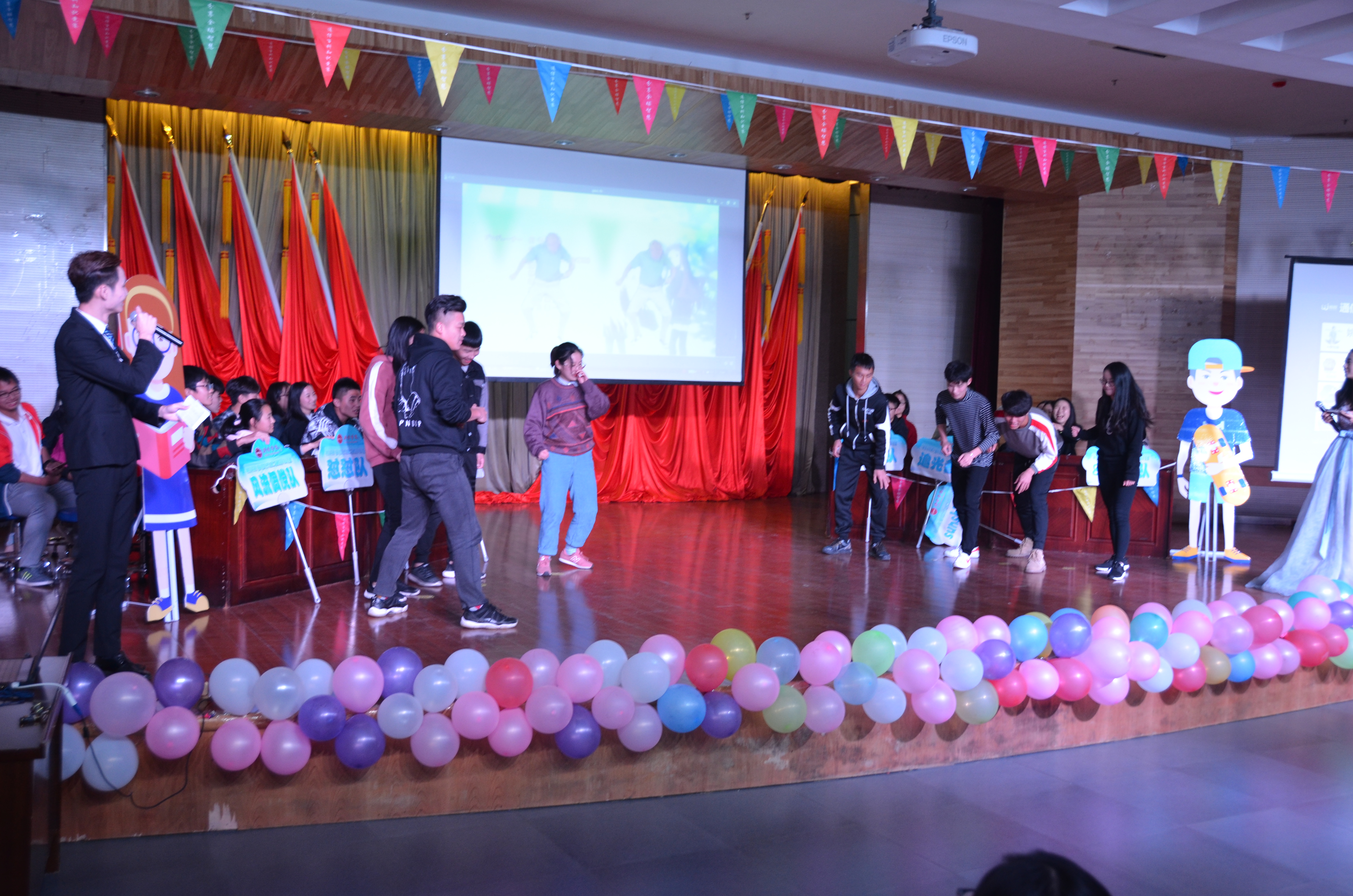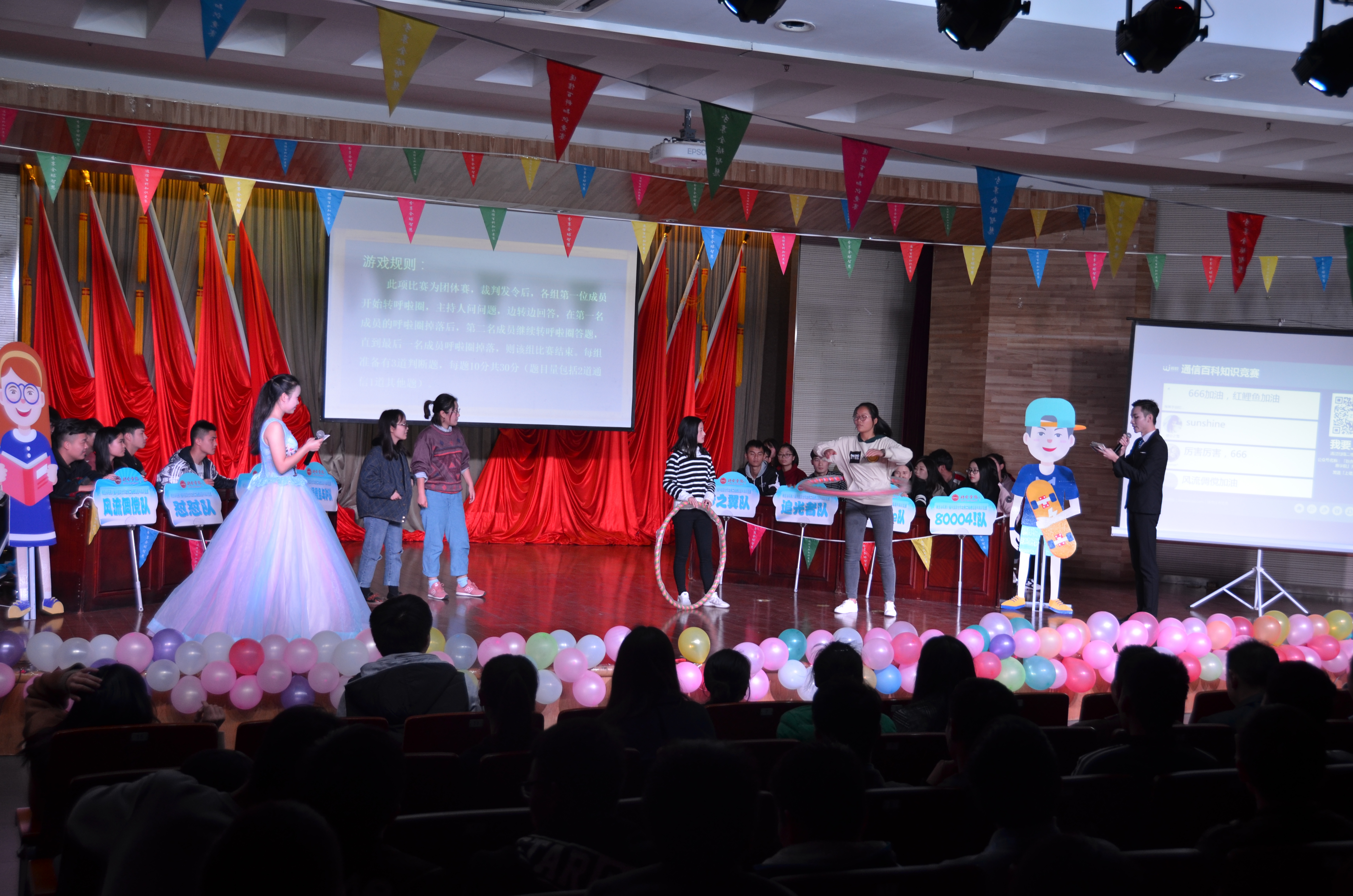 本次活动以“分享全球智慧,共创全新通信”为主题,共设四个比赛环节:边跳边答题,全民来尬舞,疯狂呼啦圈和风险抢答题。活动充分展现了选手们的团队协作能力、协调能力。比赛打破常规的知识传播模式和途径,让同学们边游戏边学习,以轻松愉快、趣味运动的形式了解百科知识。